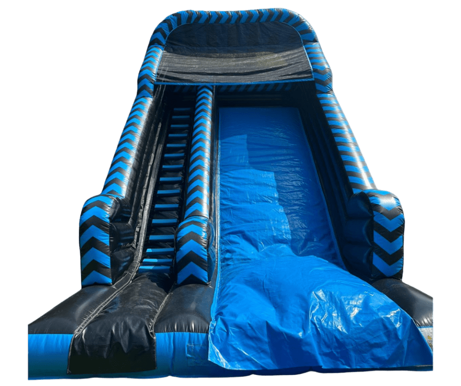 Standing at an impressive 20 feet tall, is our fierce looking, inflatable Giant Super Slide with blue and black chevrons. This bouncy slide boasts striking blue and black colours that demand attention. It's the ultimate addition to any big event, from lively park fun days to sophisticated corporate functions. Perfect for adults and children, this slide guarantees lots of fun!