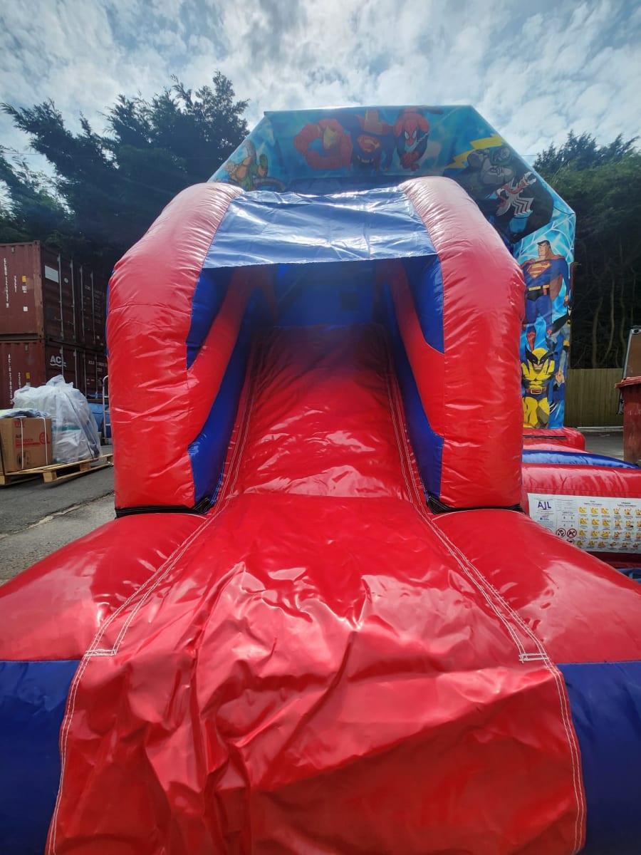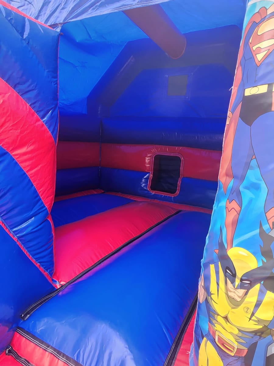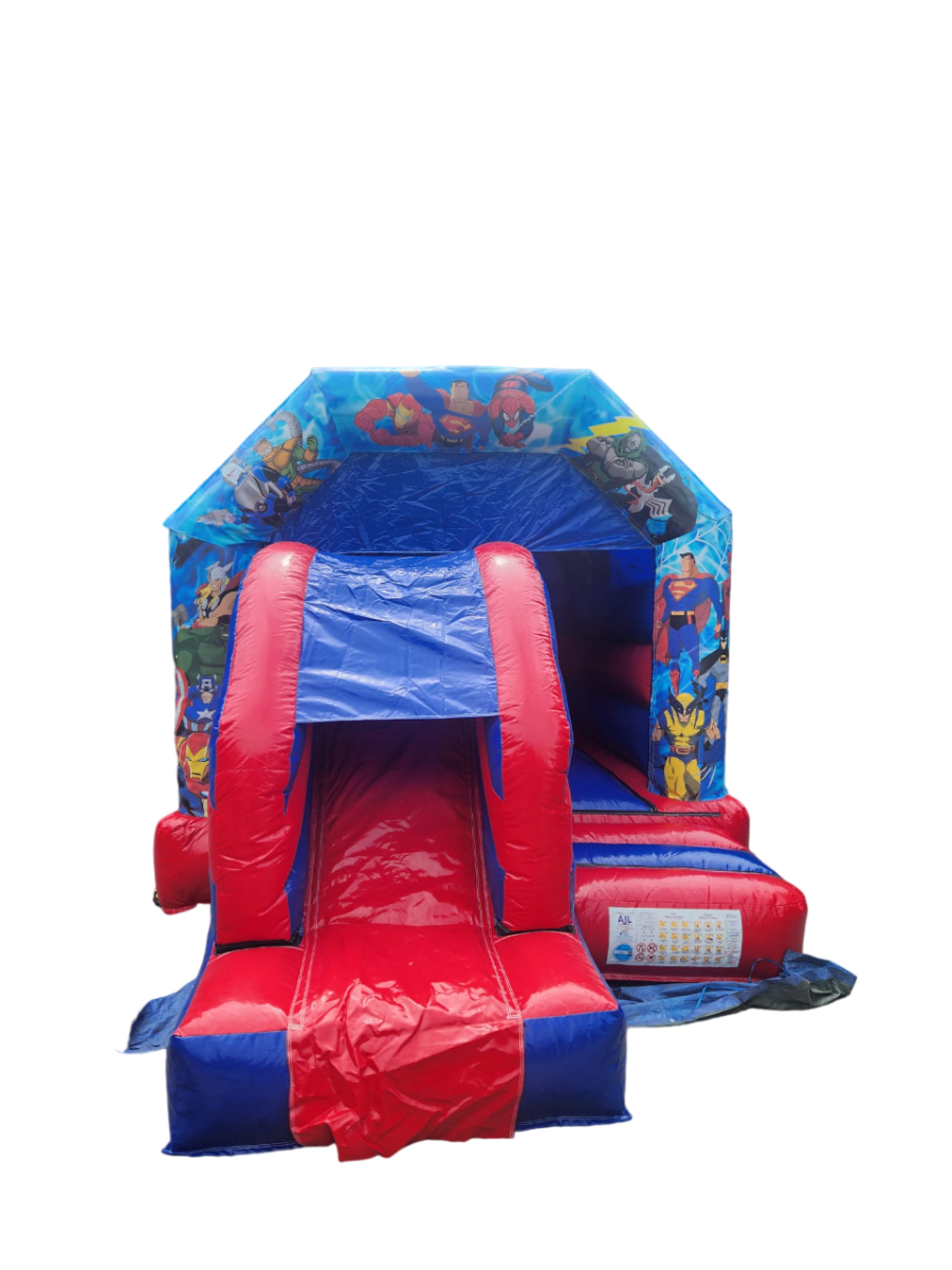 Introducing our latest addition to the lineup: the Super Heroes Bounce and Slide! Bursting with vibrant artwork featuring beloved characters like Spiderman, Superman, Ironman, and many more, this inflatable castle is every little hero's dream come true. Let your child's imagination soar as they bounce, slide, and play in a world filled with their favorite superheroes. Whether it's a birthday party or just a day of fun, this bounce and slide is sure to be a hit with kids of all ages.