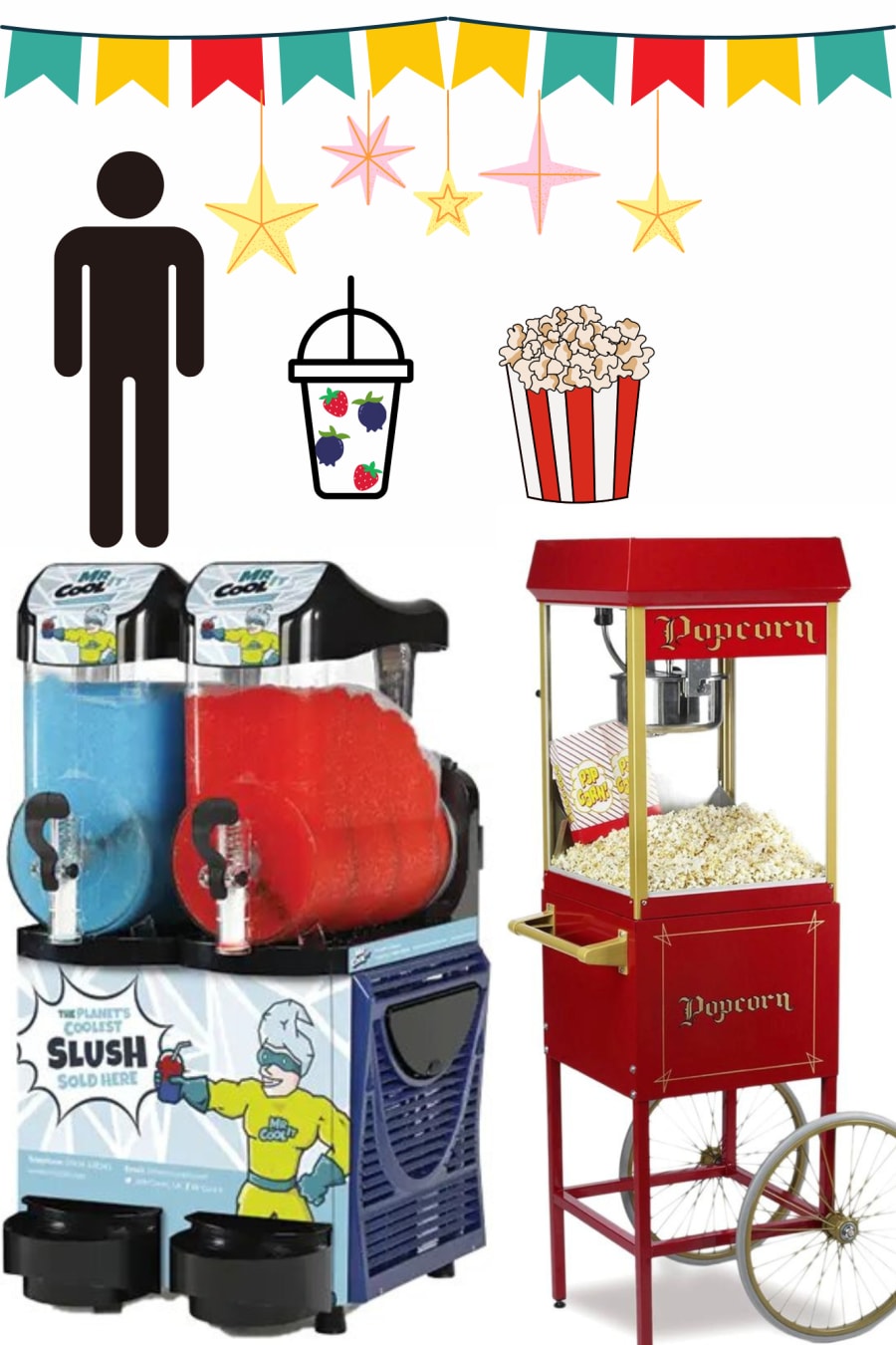 Let us turn your event into a carnival of sweetness with our slush machine and popcorn warmer. Book now and treat your guests to an unforgettable experience!