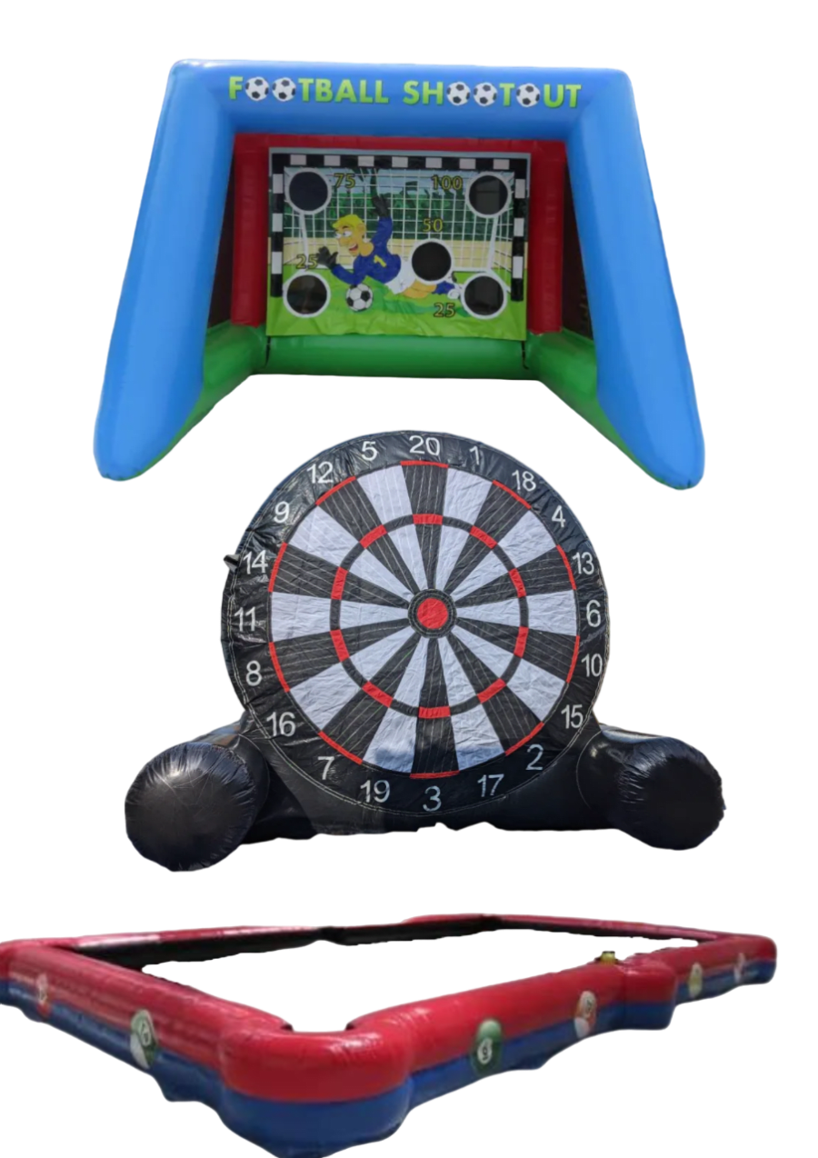 Are you ready for a football-themed adventure like no other? Our Football Frenzy Package is a game-changer for any event, from birthday parties to corporate gatherings and sports-themed celebrations. This package brings three giant-sized, action-packed football games to your doorstep: the Giant Football Shoot Out, a Real-Size Giant Inflatable Pool Table, and the Giant Kick and Stick Dart Game.