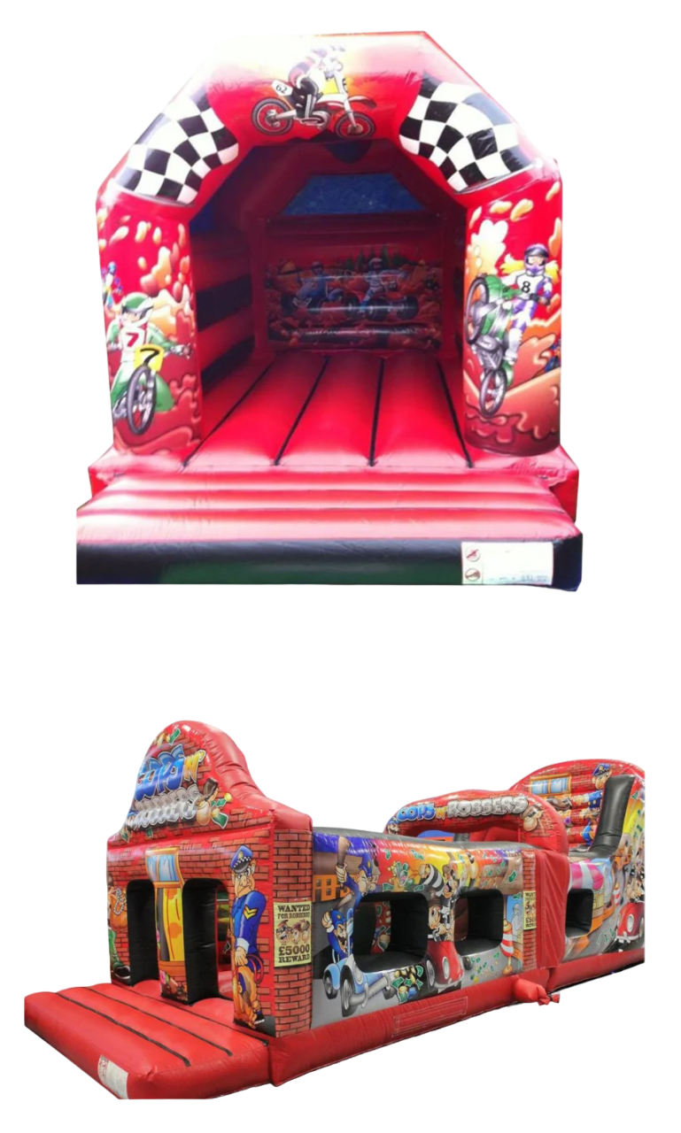 Rev up the excitement with our Quads and Motor Bikes Bouncy Castle! This inflatable masterpiece combines the thrill of off-road adventure with the bouncing joy of a classic inflatable castle. Kids can imagine themselves on a high-speed chase, riding through rugged terrain, and experiencing the thrill of the open road—all within the safety of our themed bouncy castle.